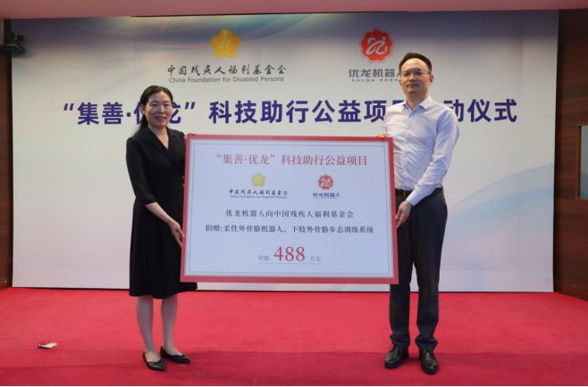 仪式上,优龙向中国残疾人福利基金会捐赠价值488万元的智能康复设备,用于资助天津市、黑龙江省、山东省、河南省和重庆市的残疾人福利基金会、康复机构等非营利机构。
